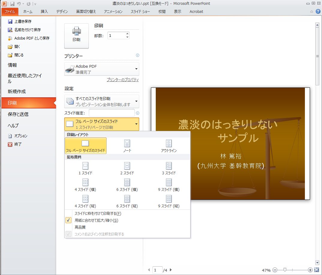 スライドの回りの余白が大きく、かつスライド自身は小さく印刷されてしまう。