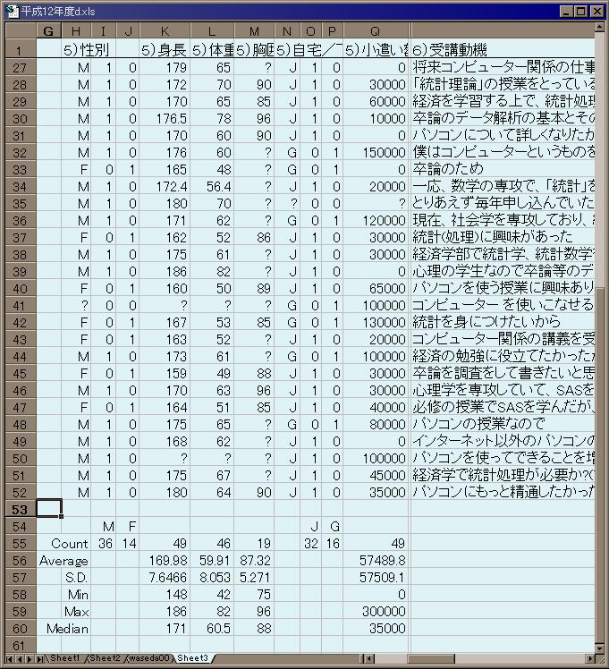 つまり、前項で作成したデータを SAS で解析するには、 stat システムに持って行く(転送という)必要がある。 なお、stat システムにはプリンタが接続されていないので、 出力に関しても UNIX から Windows に転送する必要があるが、 この実習は後日行う。