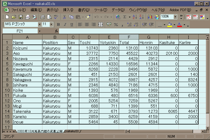[データ] 第2次小泉内閣の閣僚資産データ(2003年10月24日発表) [部分]