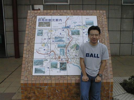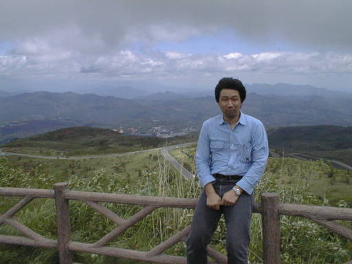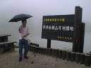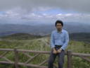 白根山の山麓をバックに (強風で髪の毛もオールバックに)